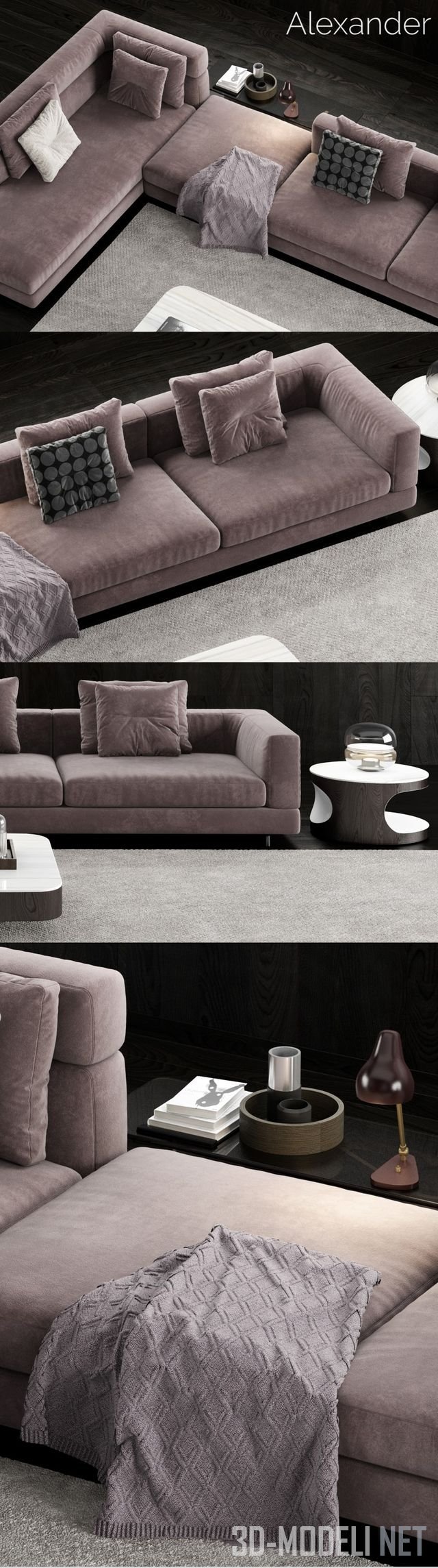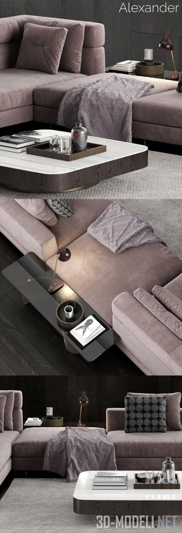 Элегантный угловой модульный диван Alexander, неяркого розового цвета, с подушками и пледом и три разнообразных столика (Milton, Bender, Boden). дИЗАЙНЕРЫ: Rodolfo Dordoni, Gordon Guillaumier, Nendo, Lucie Koldova.