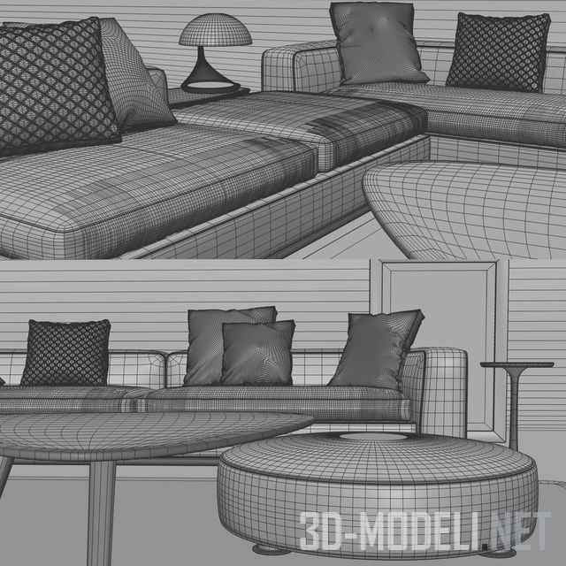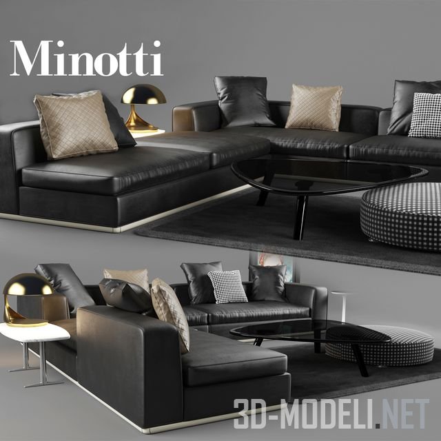 Современный модульный диван Powell от Minotti, с обивкой из черной кожи и белым цоколем. Большие кожаные подушки дополнены несколькими декоративными, в золотистых и черно-белых чехлах. Мелкий черно-белый паттерн подушки поддержан обивкой большого круглого пуфа. Черный кофейный столик на трех ногах, золотистый современный светильник на другом столике, темно-серый прямоугольный ковер и картина в черной раме с портретом в пин-ап стиле дополняют сцену.