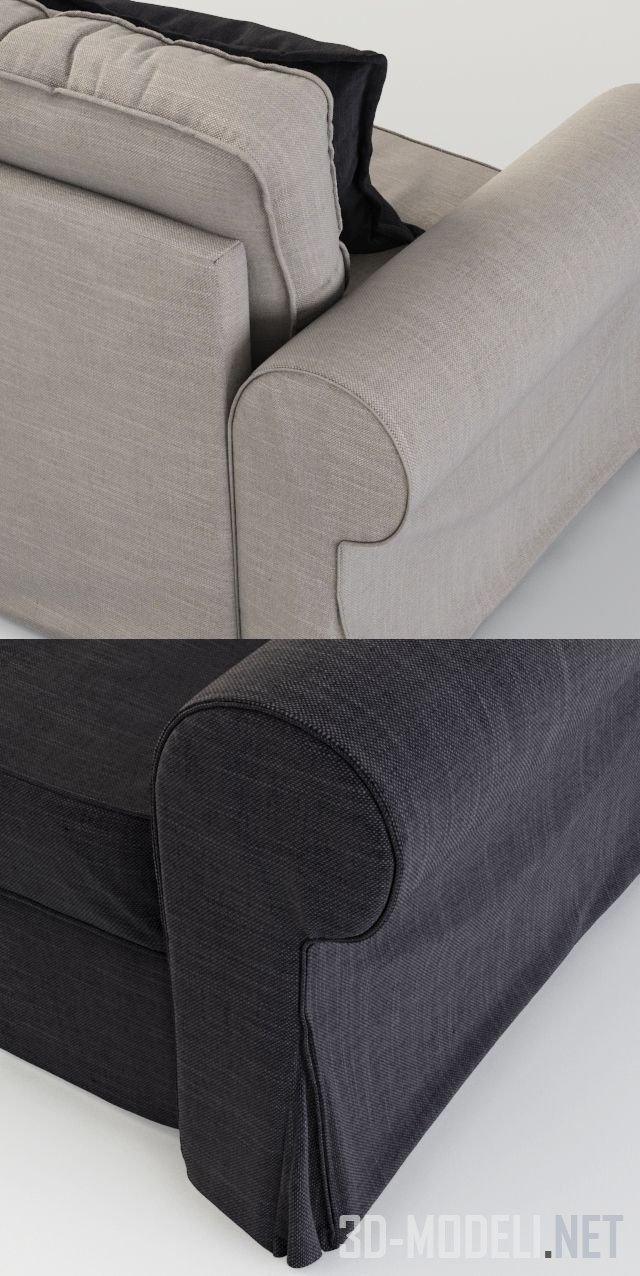 Большой мягкий диван цвета какао с молоком с двумя декоративными подушками темно-коричневого цвета и бежевого с темно-коричневым рисунком. Диван двухместный, модель BAKKABRU от IKEA.
