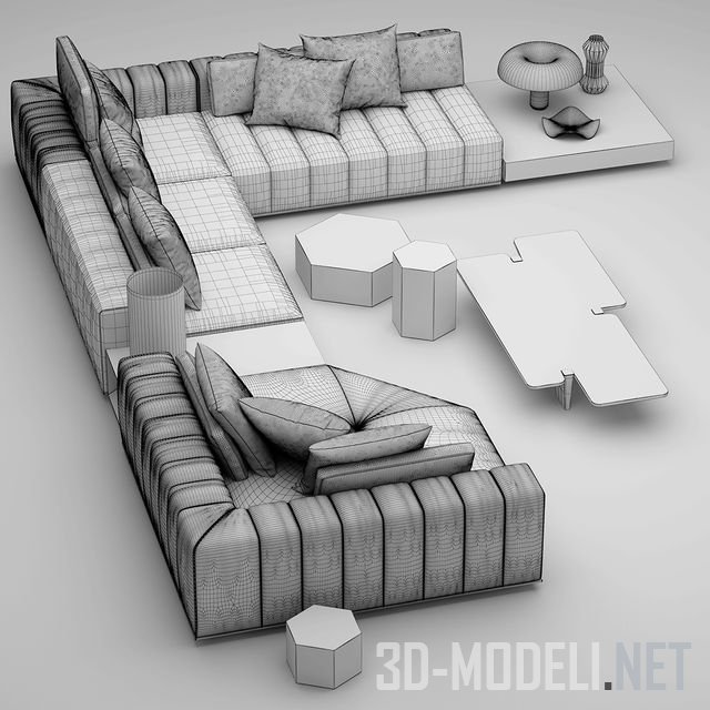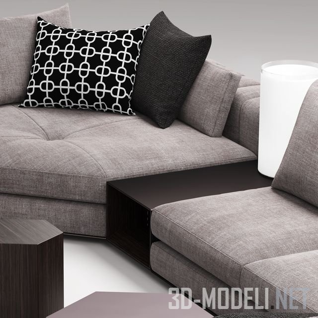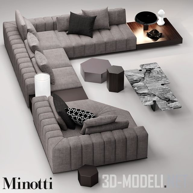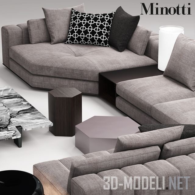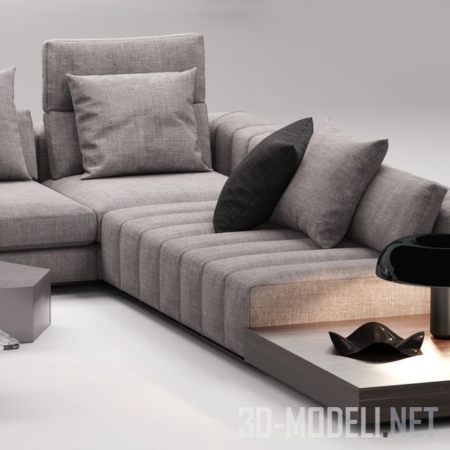 Высокого качества трехмерная модель для современного пространства, модульная система сидений Freeman от бренда Minotti. В наборе угловой диван, журнальный стол, настольная лампа, декоративные элементы.