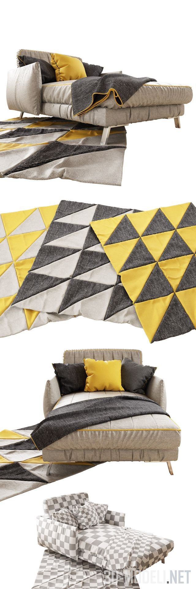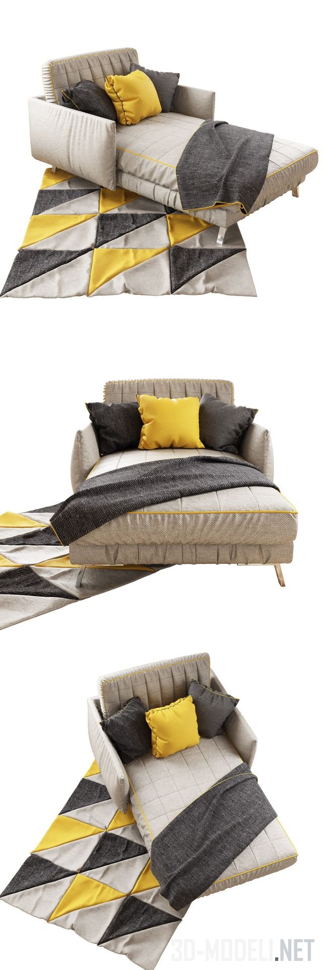 Современный раскладывающийся диван, трансформирующийся в кровать. Качественно выполненная 3d модель с текстурами. Размеры дивана: 150 x 100 x 70 см.