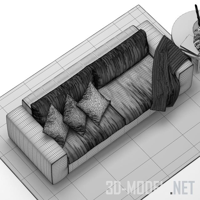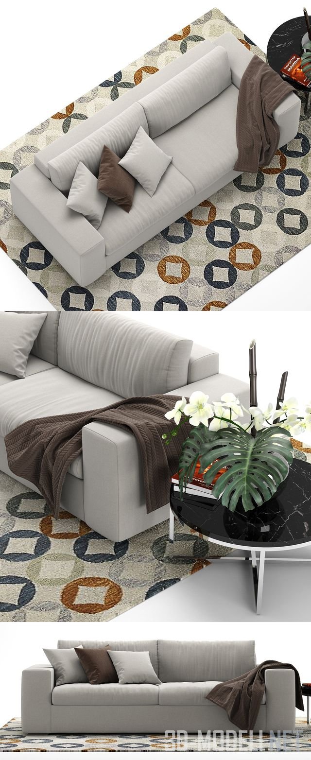 Качественная модель современного дивана от бренда Giulio Marelli, Epika. В наборе ковер и декоративные элементы: листья монстеры, орхидеи, книги.