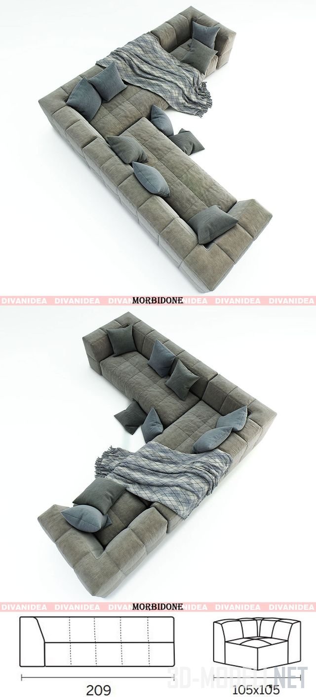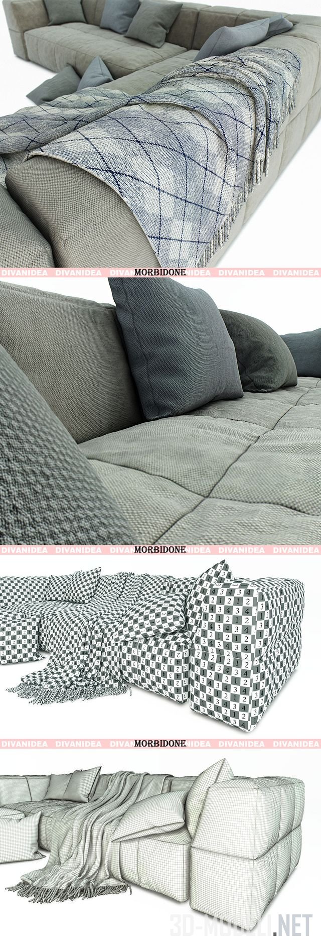 Современный модульный диван угловой конструкции, Divanidea Morbidone. Дополненный подушками и пледом, диван смотрится невероятно реалистично.