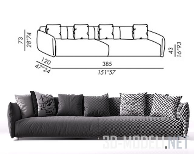 Реалистичная модель современного дивана Scott Twin от бренда Meridiani. Размер дивана: 385 х 120 х 43 (73) см.