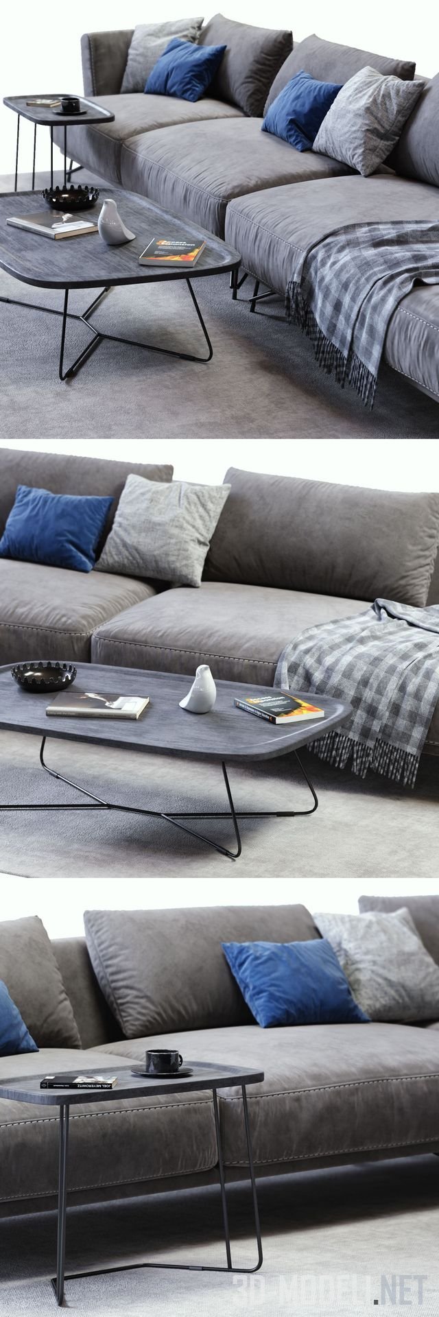 Качественный набор современной мебели от бренда Ditre Italia, в который входит диван Lennox (438 x 113 x 78 см), столик Verve (128 x 80 x 36 см, 72 x 37 x 52 см) и декоративные элементы (плед, подушка, книга, ковер, чашка).