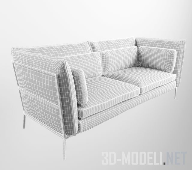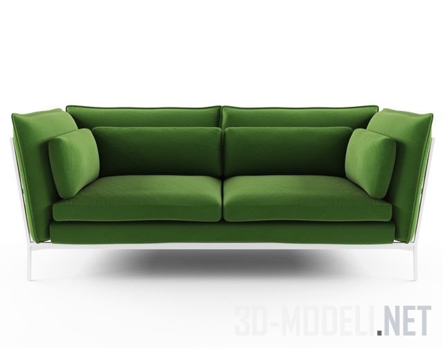 Современный диван Basket от Cappellini. Диван с травянисто-зеленой обивкой и белыми ножками. На диване у спинки и подлокотников лежит ряд узких подушек. Размеры дивана: 230 х 90 х 44/82 см.
