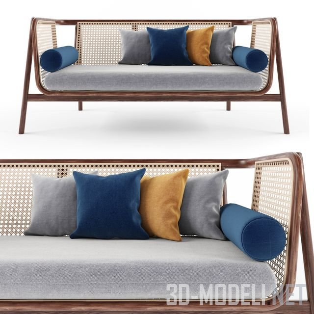 Легкий и симпатичный диван Cane sofa-02. Материалы, использованные для его изготовления и отделки: натуральная твердая древесина ясеня, ореховое дерево, ротанг, ткань. Размер дивана: 1550 x 650 x 720 мм. Сделан в Таиланде.