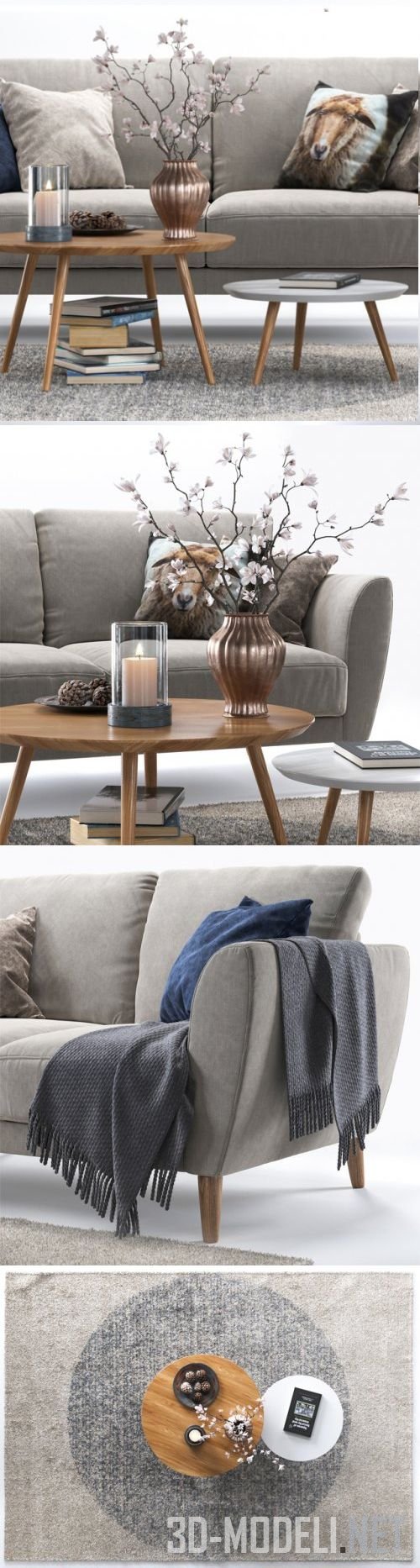 Высококачественная мебель для гостиной в скандинавском стиле. В составе диван Aria (два размера, 185 x 90 x 85 см и 143 x 90 x 85 см) с набором кофейных столиков Narvik (производитель Pohjanmaan, Финляндия). Размеры столиков: d50 x h25, d70 x 37,5 см. Ковер