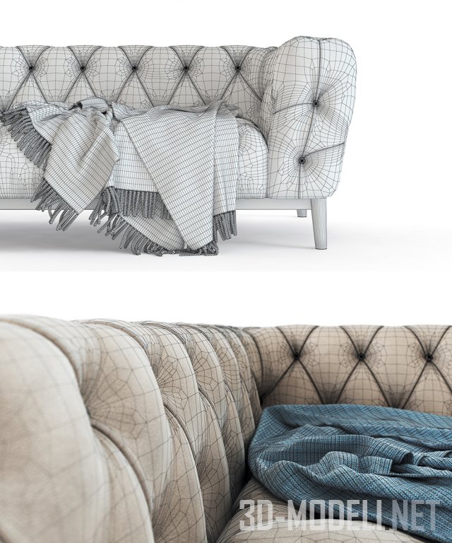 Классический диван Dokos светло-бежевого цвета с простежкой капитоне по всем поверхностям. Модель в комплекте с большим темно-синим пледом, небрежно брошенным на сиденье дивана.