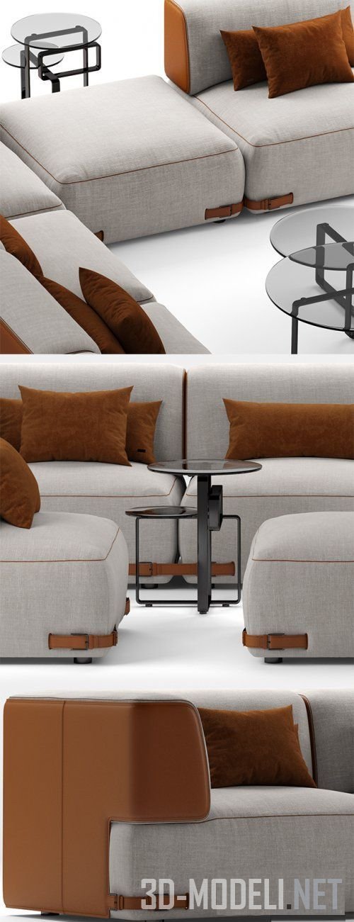 Современный диван Soho от Fendi Casa. С обивкой из серой ткани, на которой выигрышно смотрятся декоративные подушки сочного цвета и такие же вставки в торцевой части подлокотников. Возле дивана предусмотрен легкий небольшой столик с двойной столешницей.