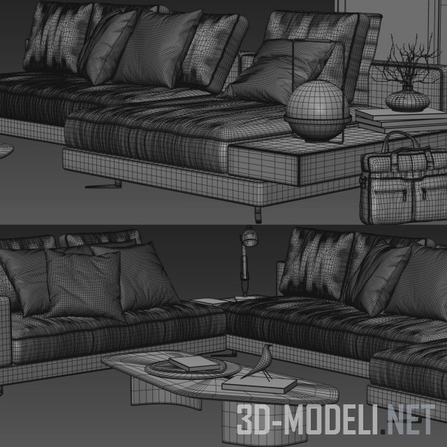Светло-серый модульный диван White от производителя Minotti. Диван с белыми, черными и оранжевыми подушками, журнальным столиком, на котором лежат книги и стоит маленькая черная фигурка птицы. В качестве декора предусмотрена черно-белая картина, светильник и черная кожаная сумка-потфель на полу.