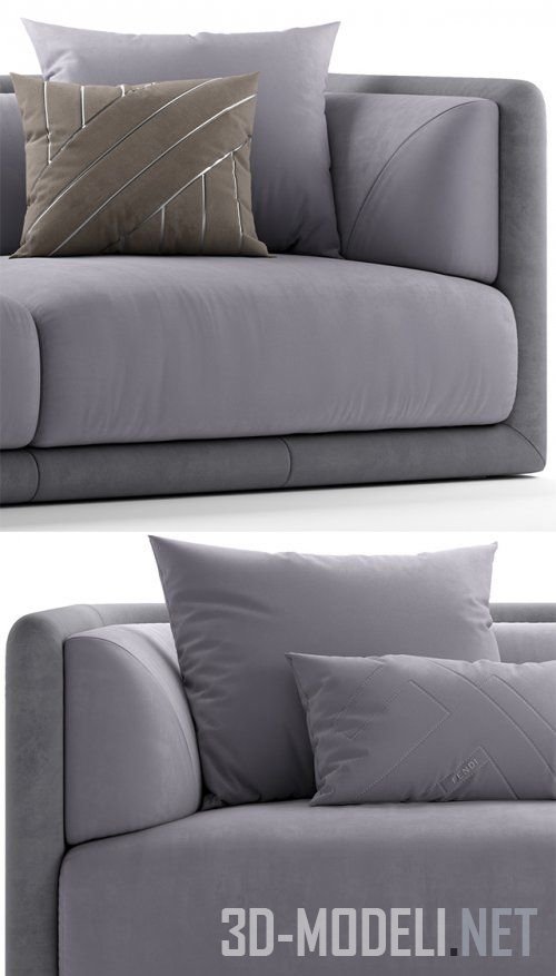 Элегантный современный диван Сonrad от итальянского бренда Fendi Casa. Диван и декоративные продолговатые подушки обтянуты мягким светло-серым текстилем. К спинке прислонена квадратная золотисто-серая подушка.