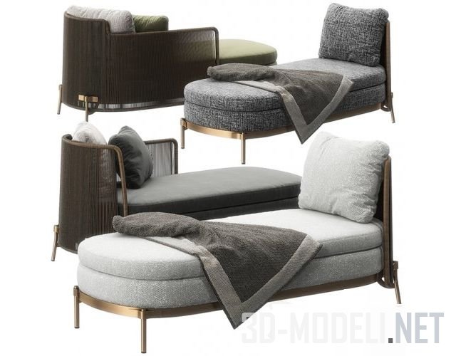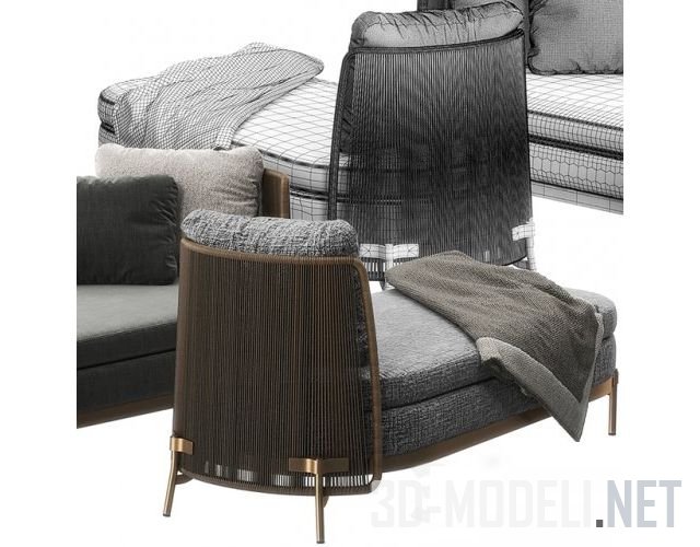 Minotti представляет оригинальные диваны для террас и открытых площадок Tape «Cord». Мягкие овальные сиденья и подушки размещены на оригинальных металлических каркасах. Спинки декорированы шнуром, натянутым на каркас. Обивки мягких элементов представлены в оттенках серого и приглушенного болотно-зеленого.