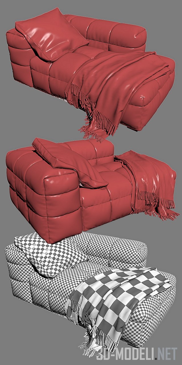 Большой уютный диван-кушетка Michelin от израильского дизайнера Arik Ben Simhon. Диван коричневого цвета, с большой мягкой подушкой и пушистым светло-бежевым пледом, небрежно перекинутым через сиденье.