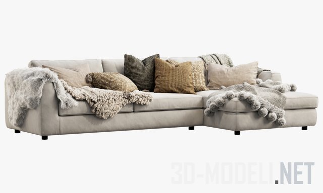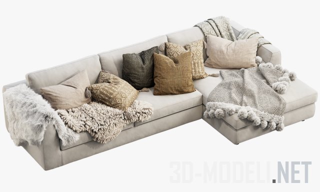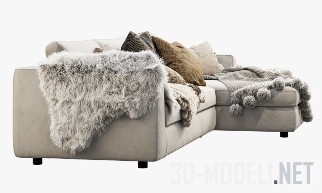 Большой уютный угловой диван EQ3 Cello. Диван с обивкой светлого цвета, на маленьких черных ножках. На диване лежат декоративные подушки и очень уютные пледы (меховые и вязаные с меховой каймой, а также пушистыми меховыми шариками).