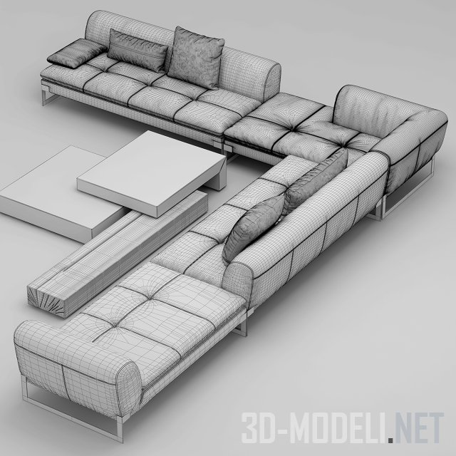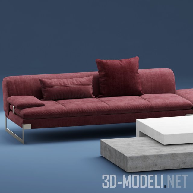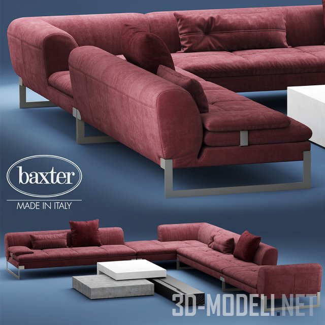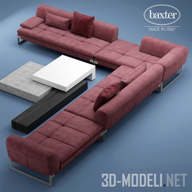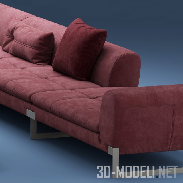 Большой угловой секционный диван VIKTOR от бренда Baxter, для интерьера в современном стиле. Диван стоит на металлических матовых ножках в форме салазок и обтянут текстилем темно-розового цвета. Несколько декоративных подушек в тон дивану прислонены к невысоким спинкам.