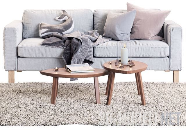 В наборе присутствует ковер VINDUM, белого цвета, с высоким ворсом, два кофейных столика STOCKHOLM из орехового шпона. На столиках лежит книга и стоит настольная светодиодная лампа RANARP.
