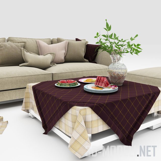 Большой угловой модульный диван, обтянутый светлым текстилем с декоративными подушками и клетчатым светло-коричневым пледом. Возле дивана квадратный низенький столик, покрытый большой бордовой салфеткой. На столе стоит ваза с зелеными ветками и тарелка с ломтиками арбуза.