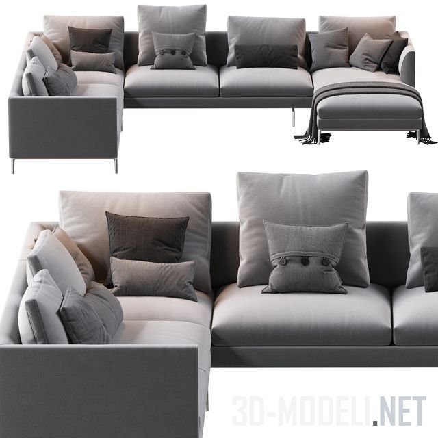 Модульный угловой диван Flamingo 1333 от итальянской фабрики Zanotta. Диван представлен в мягкой обивке светло-серого цвета. Каркас и ножки металлические. Подушки спинки с наполнением из пуха. Общий размер: 346 x 168 x 68 см, размер секции 1 – 168 x 89 см, 2 – 257 x 89 см.