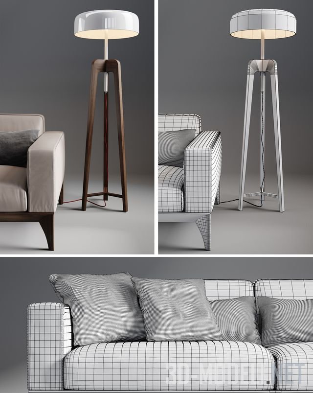 Небольшой диван Fellow Porada, выполнен в современном стиле, обтянут светлой тканью. На диване лежат декоративные подушки из зеленого, коричневого и темно-серого велюра. Рядом с диваном торшер Pileo, на высокой коричневой деревянной треноге с плоским светлым абажуром. Размер дивана: 2200 x 780 x 960, размер светильника: 151 х 50 см.