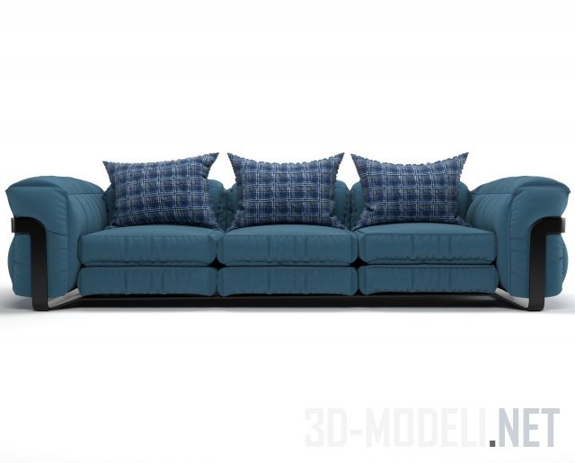 Современный диван Marilyn от итальянского бренда Baxter. Диван с низкой спинкой и толстыми боковинами на высоту спинки. Диван обтянут текстилем красивого цвета. К спинке прислонены три большие подушки в синюю клетку.
