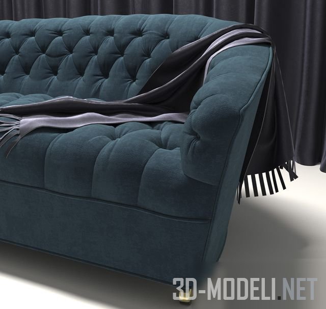 Диван со скругленной задней частью и простежкой капитоне на сиденье и спинке. Темный, зелено-синий плюш обивки дивана отлично сочетается с комплектом графитовых штор и пледом, наброшенным на диван. Немного золотистого на карнизе штор и ножках дивана добавили небольшой яркий блик.
