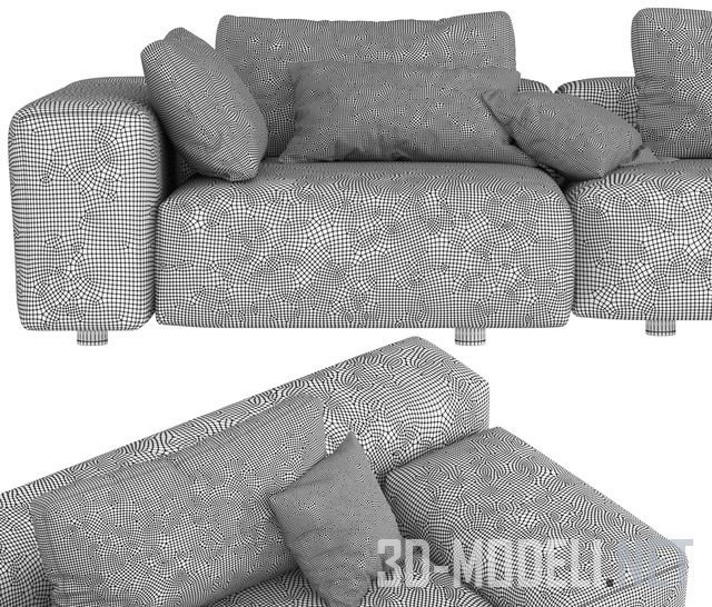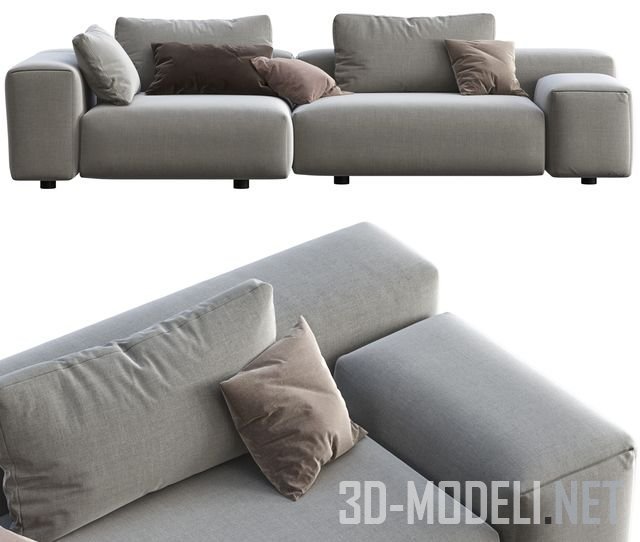 Современный минималистичный модульный диван Wendelbo Raft. Габарит дивана: 308 х 110 см. Текстиль обивки имитирует льняной холст. С ним хорошо сочетаются бледно-коричневые диванные подушки.