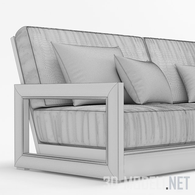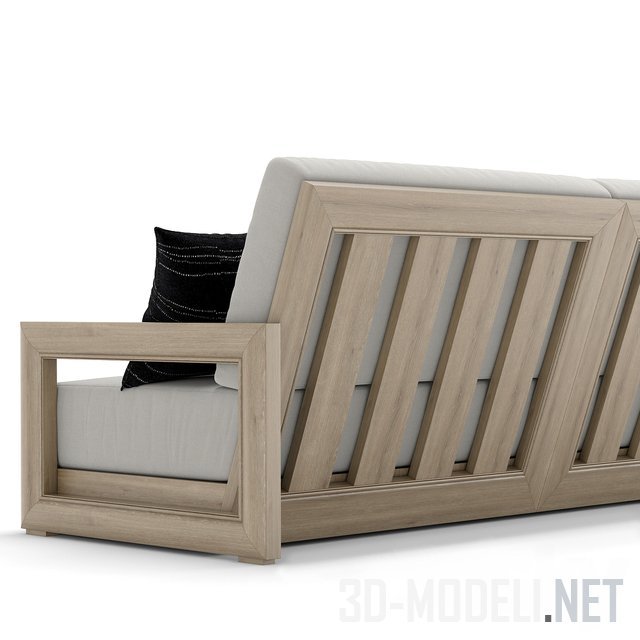 Двухместный современный диван для открытых площадок, модель Costa от бренда Restoration Hardware. На деревянной раме с прямоугольными перилами размещены прямоугольные мягкие подушки в белых чехлах. Четыре декоративные подушки - черные с белыми орнаментами.