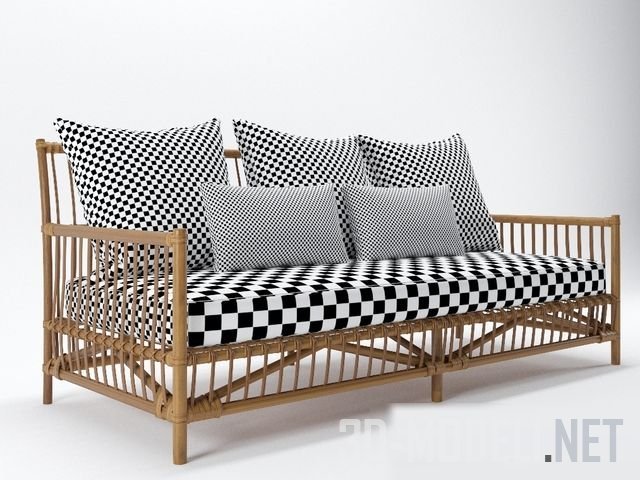 Датский бренд Sika design представляет модель дивана Caroline. Диван выполнен в виде рамы из ротанга с рамами подлокотников и спинки. Плоскости в рамах затянуты рейками из ротанга. На ротанговую жесткую основу уложены светло-серый прямоугольный матрас и диванные подушки нескольких размеров и дизайнов. Маленькие подушки - в чехлах светло-серого цвета. Большие - в пестрых чехлах с крупным цветочным принтом зеленого и красного цвета. Габарит дивана: 82 х 197 х 82 см.