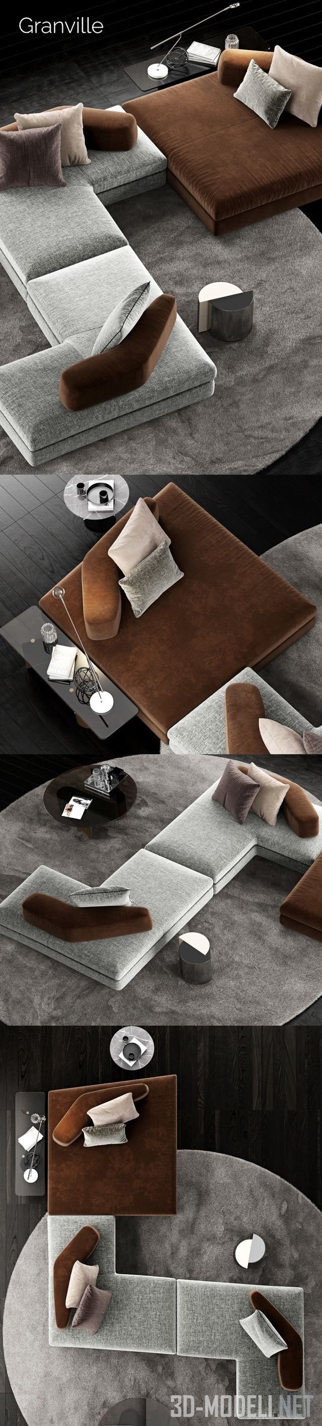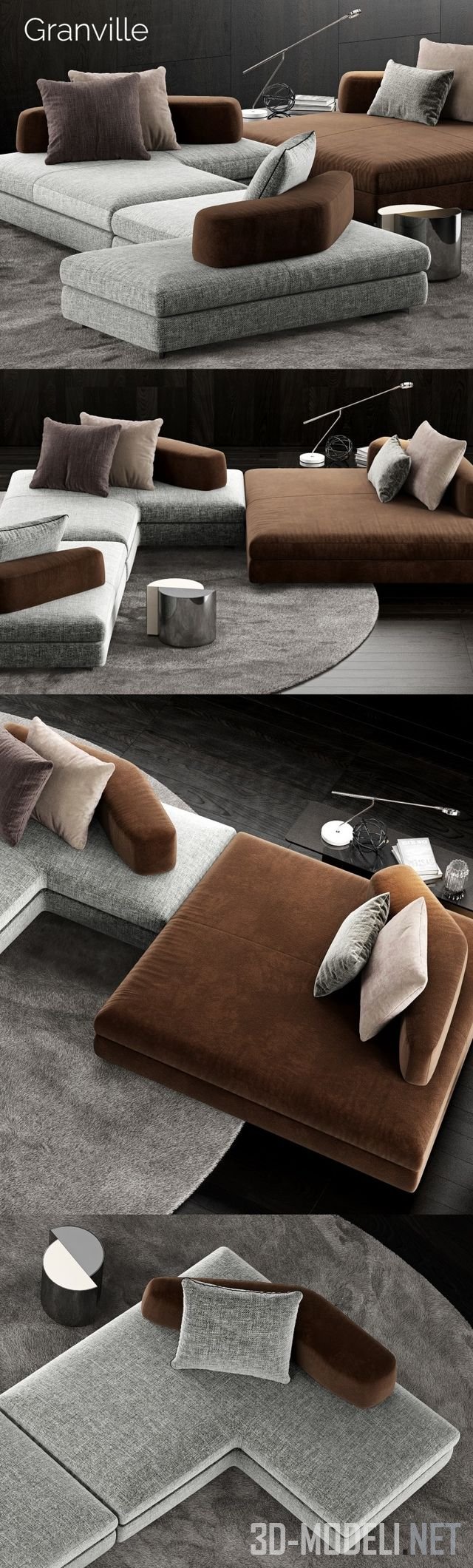 Модульный диван для современного интерьера, модель Granville Sofa 4 от фабрики Minotti, Италия. Диван состоит из нескольких прямоугольных секций с обивкой из серого текстиля, большой секции, обитой коричневым плюшем и спинок из угловых элементов. Однотонный ковер серого цвета, круглой формы, а также кофейные и журнальные столики, светильник и другие детали оживляют набор.