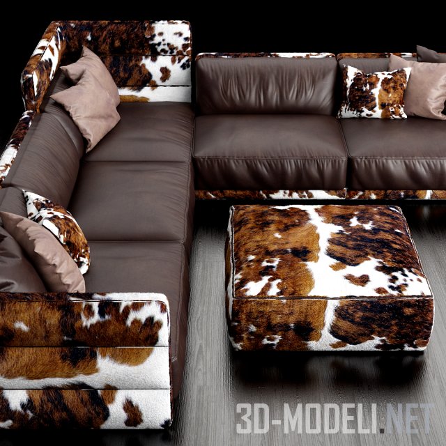 WAFER из коллекции Dandy Home, угловой кожаный диван. Основной тон кожаной отделки дивана шоколадный. Приставная секция, некоторые подушки, детали спинки и подлокотников отделаны коровьей шкурой, белой, с рыжими пятнами.
