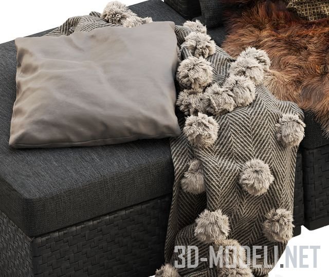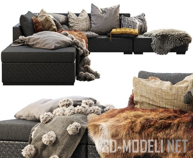 Модульный диван темного цвета с плетеным из ротанга основанием и мягкими сиденьями. Модель 4M от Brown Jordan. На диване множество разнообразных подушек, шкур и ковриков в скандинавском стиле.