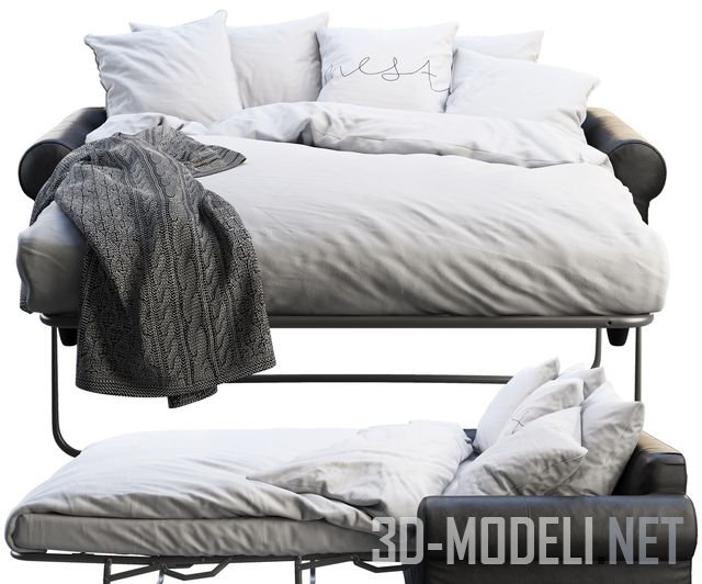 Современный трехместный диван-кровать IKEA Fixshult, обтянутый черной кожей, представлен в разложенном виде. На диване лежит постельное белье белого цвета, пять больших мягких подушек и серый вязаный плед.
