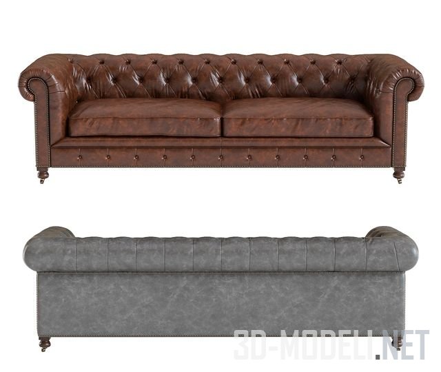 Классический английский диван Kensington от бренда Restoration Hardware. Диван отделан коричневой кожей с декоративной прострочкой капитоне. Отличается закругленной спинкой и подлокотниками такой же высоты. Представлен вариант диване в серой коже. Будет очень хорошо выглядеть в интерьере кабинета в классическом английском стиле.