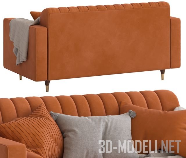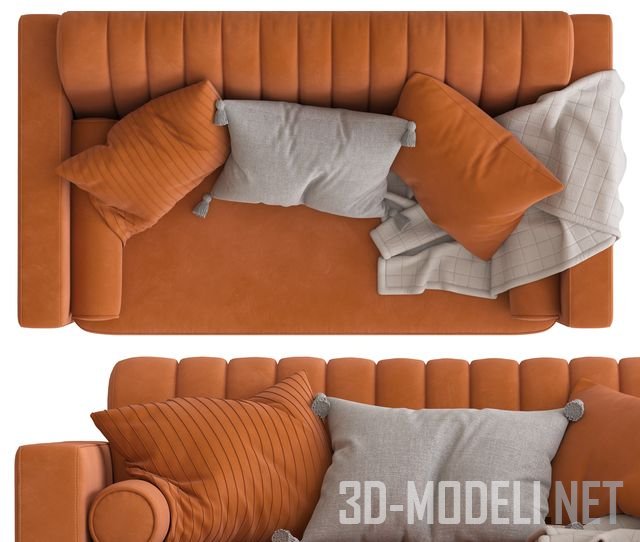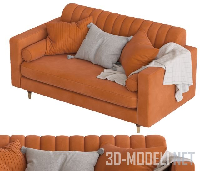 Двухместный диван Cult Furniture Belgravia, с вертикальной декоративной прострочкой спинки. Обтянут текстилем оранжевого цвета. На диване лежат валики и подушки в цвет обивки и большая серая подушка и плед. Размеры дивана: 830 х 1680 х 880 мм.