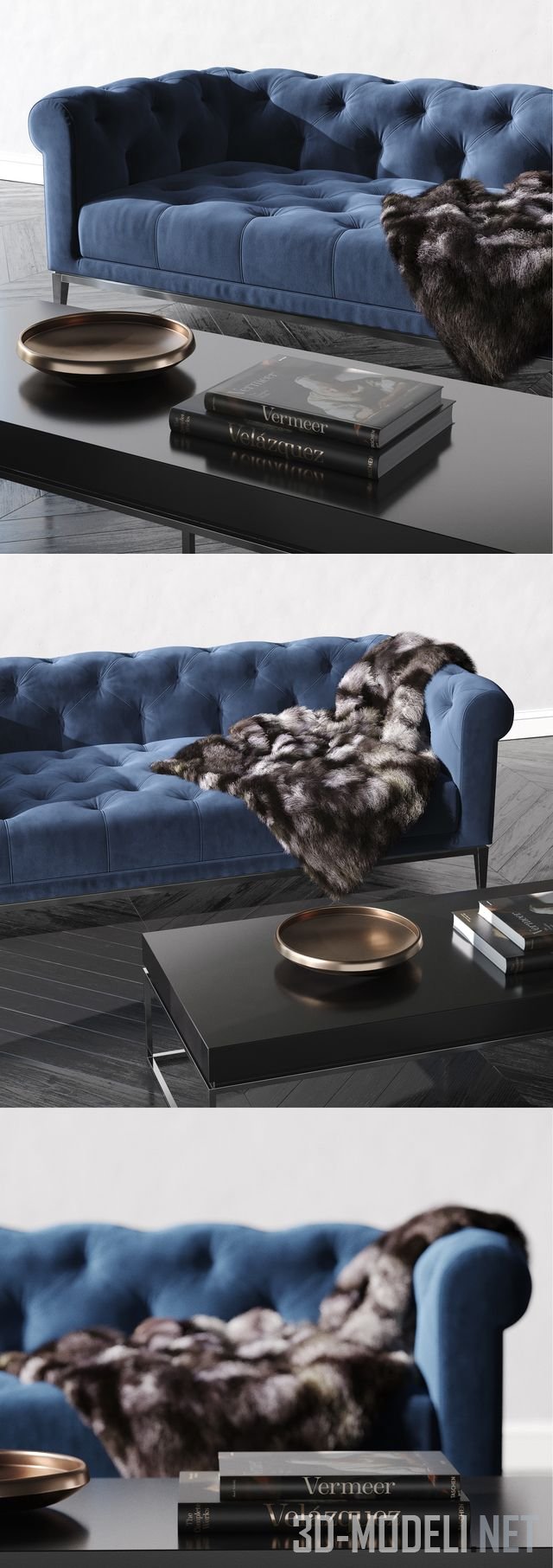 Набор мебели от бренда Restoration Hardware. В основе небольшой элегантный диван CHESTERFIELD на светлых ножках. Обтянут синим велюром с декоративной простежкой капитоне. На диване лежит пушистый меховой плед коричнево-белой расцветки. Размер дивана 2133 x 1003 x 711.