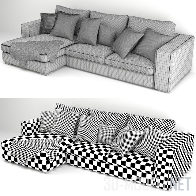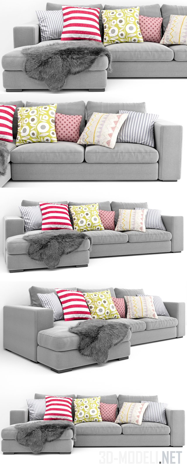 Современный комфортный диван от бренда Boconcept, серия Cenova. Диван обтянут дымчато-серым велюром. Размер дивана: 2870 x 1560 x 885 мм. На диване яркие, цветные декоративные подушки. Пушистый меховой серый плед хорошо вписывается в концепцию декора.