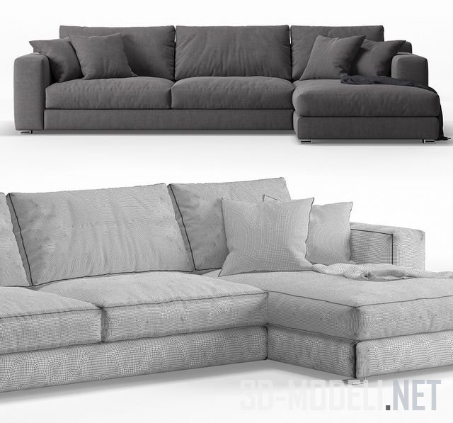 Угловой диван Cts Salotti Roger, дизайн Marconato&Zappa, обит тканью темного цвета. Roger – это система элементов дивана с большой композиционной универсальностью и комфортом, благодаря подушке, расположенной под спиной на спинке дивана. В углу дивана лежат две подушки в тон обивки. Габариты дивана: 335 х 172 х 86 см.