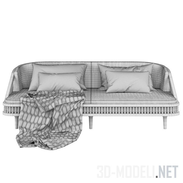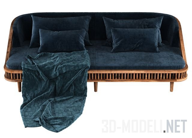 Современный диван KBH Dedar ручной работы производства Дания. В его дизайне сочетаются датские, итальянские и японские столярные изделия и эстетика. Диван изготовлен из мореного дуба средней плотности и имеет мягкую спинку и сиденье темно-синего цвета. На поверхности лежат темно-синие декоративные подушки и плед.