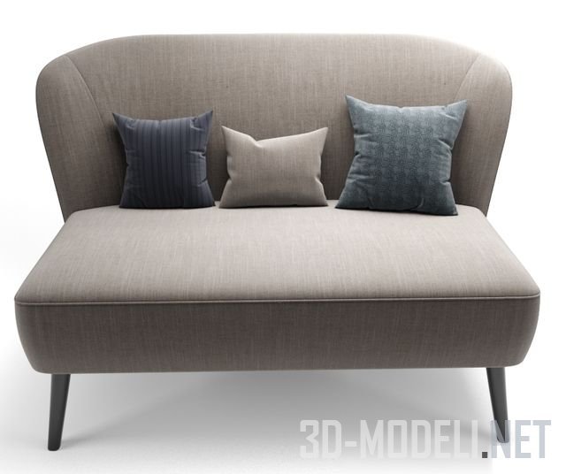Небольшой винтажный коктейльный диванчик от Moleta Munro. Диван с высокой закругленной спинкой. Диван обтянут светло-серым текстилем и стоит на высоких темно-серых ножках. На сиденье дивана лежат три декоративные подушки разного цвета.