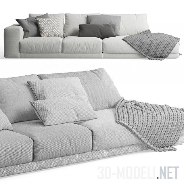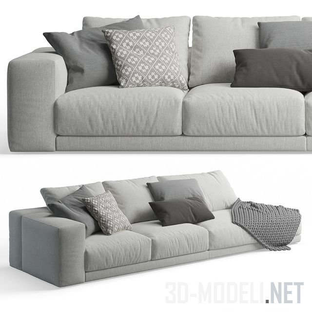 Большой мягкий диван Hills от Swan. Диван современной формы, с мягкой прямоугольной боковиной с одной стороны. Обтянут текстилем серого цвета. На сиденье лежат несколько декоративных подушек и вязаный плед. Габариты дивана: 1000 х 3200 х 780 мм.