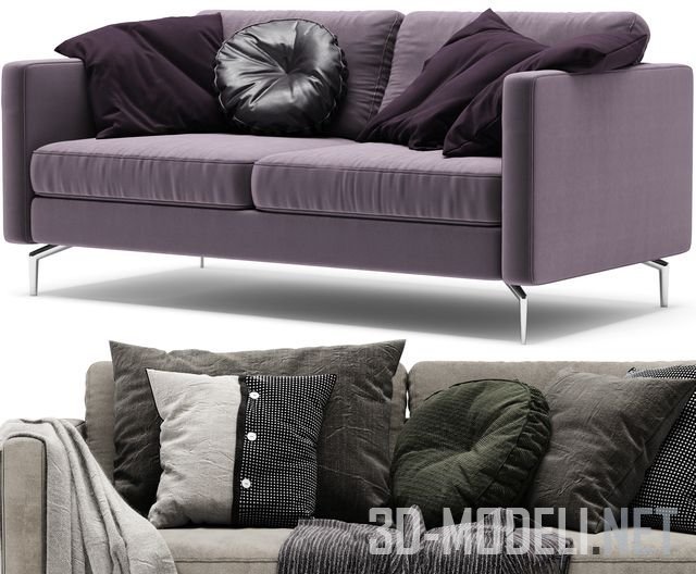 Современный мягкий диван Osaka A от производителя BoConcept, отличный выбор для современного интерьера. Диван имеет прямоугольные формы и небольшие металлические ножки. В сцене представлены два варианта обивки и декора: сиреневая с подушками фиолетового цвета и светло-серая с подушками цвета хаки, клетчатыми с декоративной застежкой и двумя пледами.