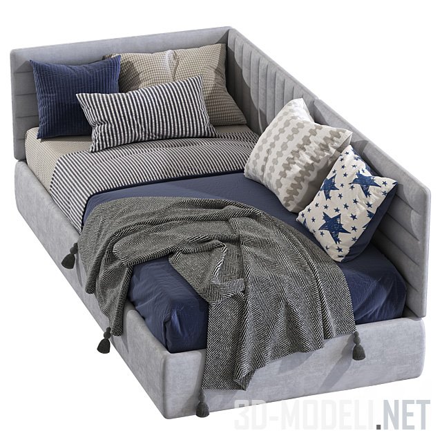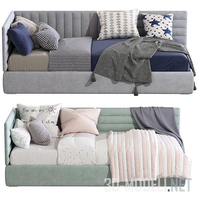 Современный диван-кровать с одним подлокотником-изголовьем и спинкой. Размером 1х2м. Представлены два варианта обивки, белья и декоров (первый - бледно-зеленый с белым и бледно-розовым, второй - оттенки серого с синим).