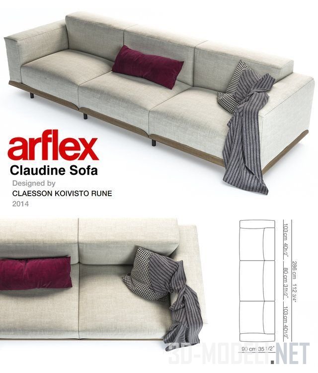 Прямой современный диван в минималистичном стиле Arflex Claudine, с невысокой спинкой и подлокотниками. Габарит: 286 х 90 см. Представлены два варианта текстильной обивки дивана: светло-серого льняного полотна и светло-василькового цвета. В обоих вариантах - бордовая диванная подушка, подушка в мелкую черно-белую клетку и серый полосатый плед дополнительно декорируют диван. Основание дивана, на невысоких черных ножках, выполнено с небольшим фигурным бортиком из дерева.