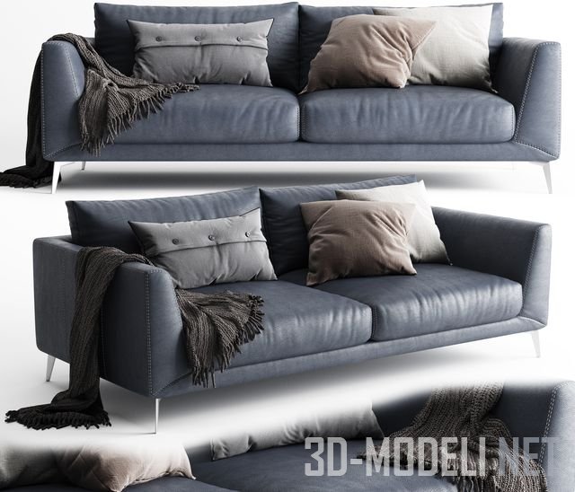 Двухместный прямоугольный современный диван BoConcept Fargo от дизайнера Anders Norgaard. Изюминкой модели из серой кожи является крупная светлая прострочка по периметрам элементов конструкции и декоративные диванные подушки в охристых тонах. Одна из подушек дополнительно декорирована имитацией планки рубашки, застегнутой на крупные пуговицы. Коричневый плед в стиле лофт добавляет ощущение открытого чемодана с одеждой. Габарит дивана: 84 х 250 х 99см. Сиденье: 41 см. Подлокотники: 66 см. Тонкие хромированные ножки: 14 см.