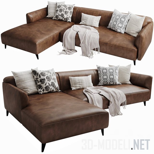 Современный угловой диван Nodena Chaise Lounge от Boconcept. Обивка дивана светло-коричневая с подпалинами кожа. Невысокие ножки - деревянные. Минималистичные формы дивана слегка разбавлены декоративными подушками в светлых льняных чехлах с орнаментами серых оттенков и светлым в полоску пледом.