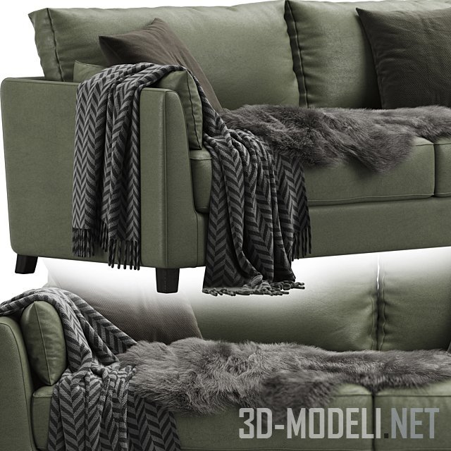 Прямой двухместный диван Bisse от Meridiani с кожаной обивкой болотного цвета. Невысокие деревянные ножки - черные. На сиденье дивана - шкура с серым мехом, диванные подушки в чехлах черно-серого и черно-зеленого цветов и плед с черно-белым рисунком-«елочкой». Длина дивана - 2м.