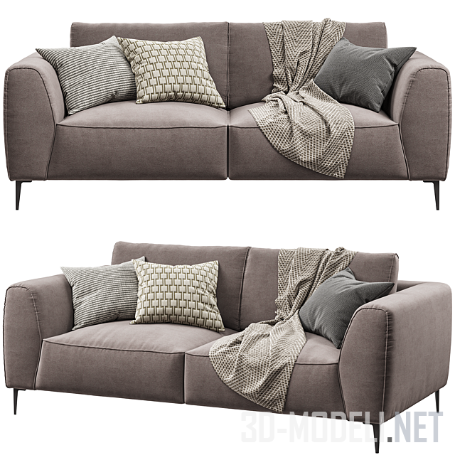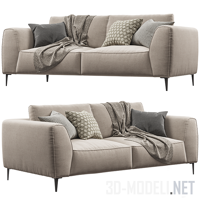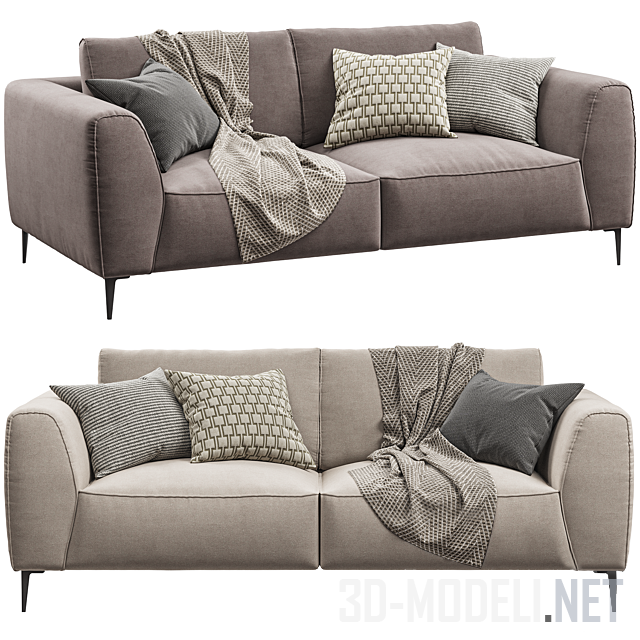 Классический неразборной двухместный диван Chateau d'Ax Dudy, с тканевой обивкой в двух вариантах (бежевой и какао). Минималистичные прямые линии силуэта, невысокие тонкие черные ножки, плед и диванные подушки с геометрическими паттернами в тон обивкам. Габарит: 205х108х86см.
