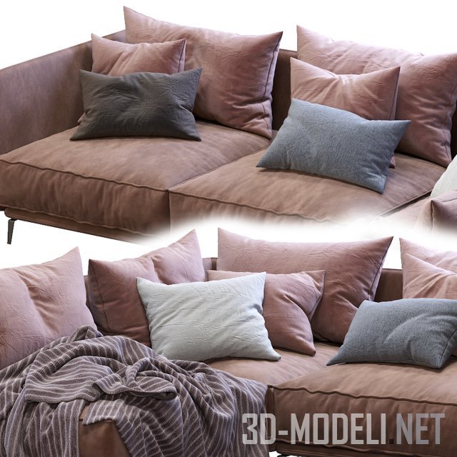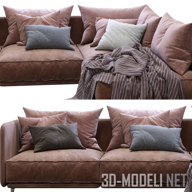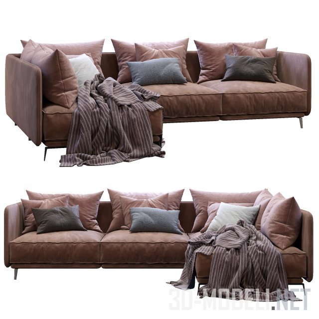 Угловой диван из рыжей рустикальной кожи K2 от Arflex, с мягкими подушками на спинке. Небольшие диванные подушки и плед подобраны в сочетание с обивкой. Подушки коричневого, серого и грязно-белого цветов. Плед - в коричневую полоску. Корпус дивана смонтирован на небольших тонких ножках.