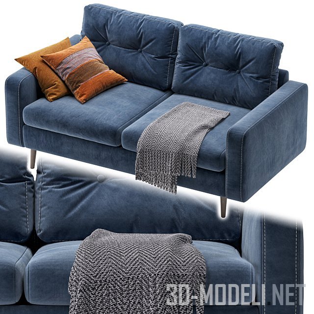 Простой современный диван Deans Mini Velvet Blue небольшого размера, в «джинсовом» стиле, с парой декоративных подушек в чехлах охристых тонов и пледом в мелкую черно-белую «елочку». Темно-синяя текстильная обивка дивана декорирована двойной крупной белой прострочкой. Ножки невысокие, деревянные.
